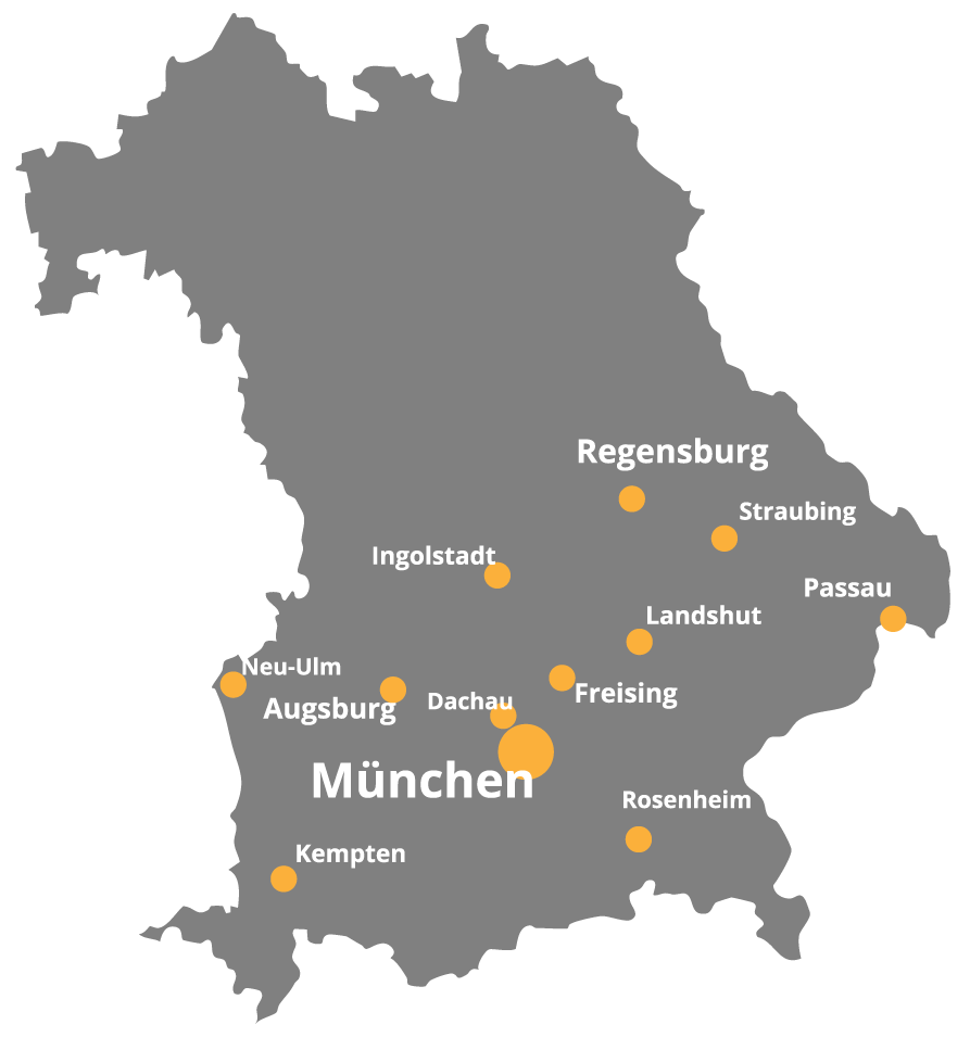 Unser Servicegebiet umfasst München, Augsburg, Ingolstadt, Regensburg, Landshut, Rosenheim, Dachau, Straubing, Passau, Kempten, Neu-Ulm – und das gesamte Gebiet dazwischen.